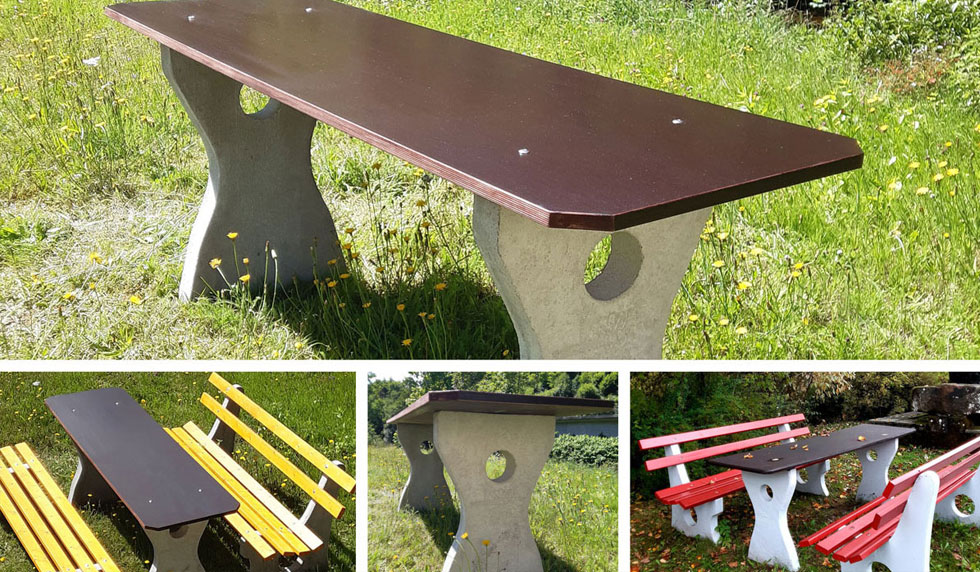 Stabile Tischfüße aus Beton zum Eingraben mit einer wetterbeständigen verleimten Mehrschicht-Holztischplatte. Die Holztischplatte lässt sich einfach und schnell auf die Tischfüße aufschrauben und auch austauschen. Lieferbare Ausführung zum Eingraben.
